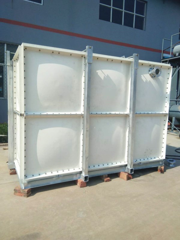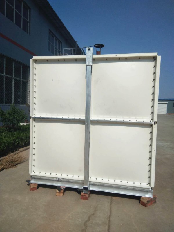 無(wú)內(nèi)件外加固玻璃鋼水箱設(shè)計(jì)內(nèi)加強(qiáng)結(jié)構(gòu)型式,水箱箱體為型板裝配氬弧焊接而成,型板拼裝交叉部位設(shè)計(jì)雙向加強(qiáng)聯(lián)桿。箱體側(cè)板與底板間設(shè)置垂直加固柱,水箱側(cè)板四周外每層相鄰。型板間設(shè)置水平加強(qiáng)板,加強(qiáng)材料同箱體材料。水箱底部設(shè)置鍍鋅槽鋼支架。水箱附件有檢查孔、內(nèi)外扶梯、工藝管口、材料均為不銹鋼,水箱工藝管口按用戶提供的圖樣設(shè)計(jì)。
