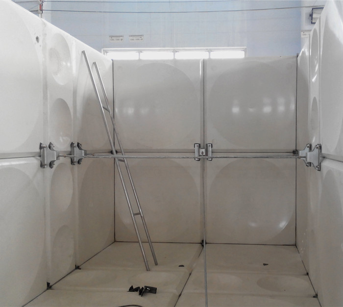 3:拉筋。如果僅僅用水箱板和膠條組成我們需要尺寸的水箱,雖然不透水了,但是還不能盛水,因為盛水之后水箱會承受一個向外的張力,必須加上拉筋系統(tǒng)受力,否則玻璃鋼水箱會形成一個高力矩體系,很容易撐壞。拉筋系統(tǒng)有圓鋼,內外拉筋板,對拉螺栓。
