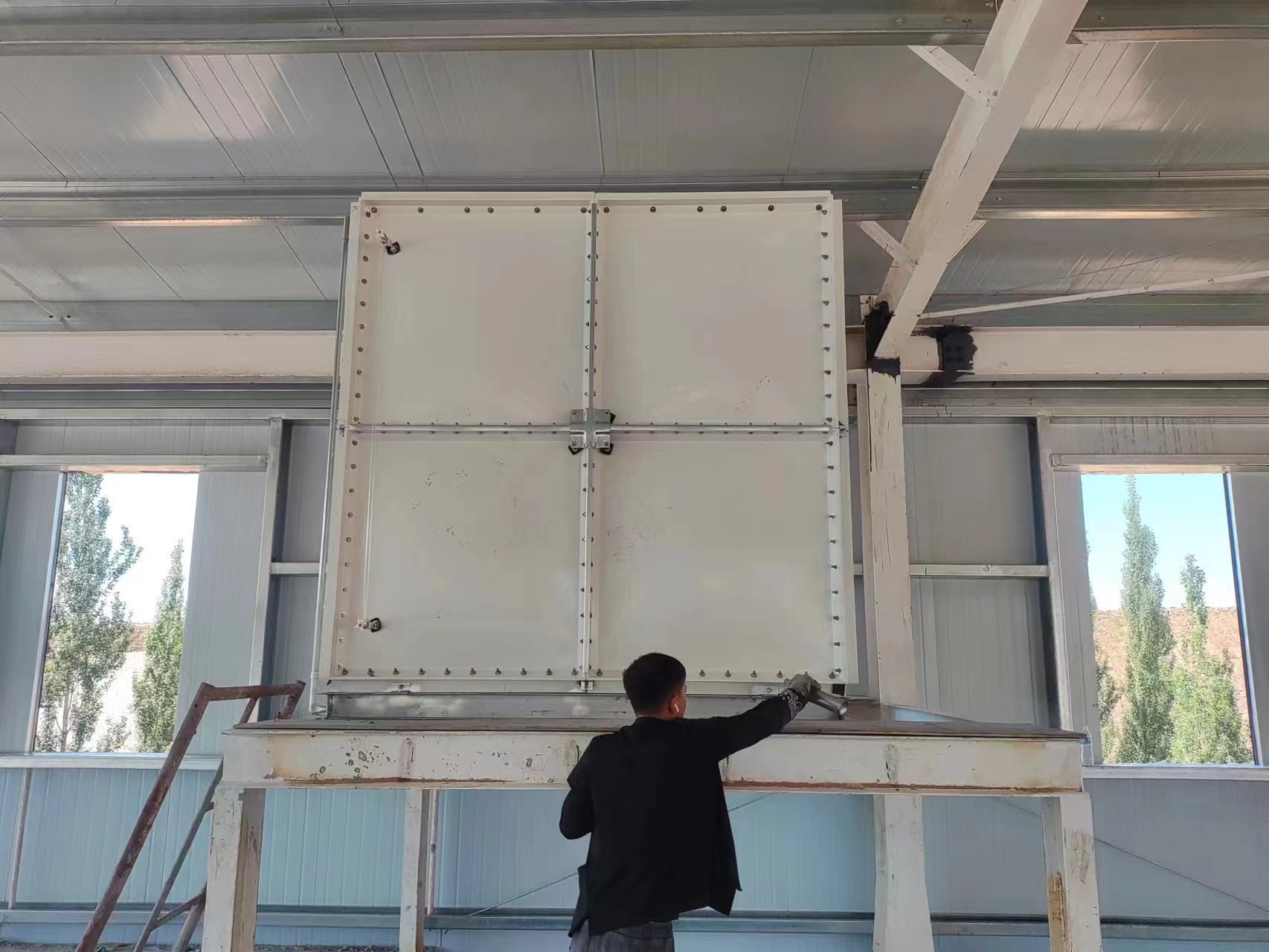 經(jīng)過一天多時間的安裝,我公司承接的山西榆社縣高速救援維修中心6立方玻璃鋼水箱已經(jīng)安裝試水完成,此次水箱用做生活用水。根據(jù)客戶需要安裝在樓道頂部,客戶用工字鋼加固焊接基礎(chǔ)?,F(xiàn)場安裝圖如下: