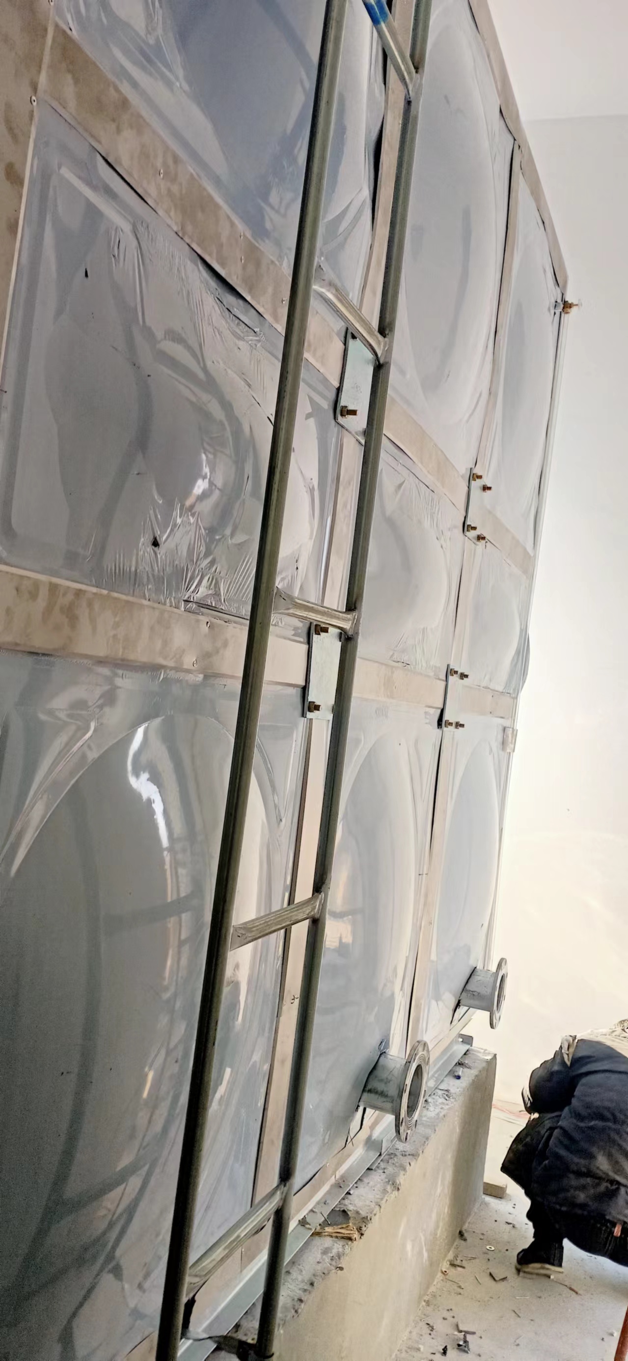 我廠承接的這臺(tái)49立方玻璃鋼保溫水箱安裝于山東省濱州市陽信縣中悅悅心城,此次水箱內(nèi)部采用SMC玻璃鋼水箱,外部采用聚氨酯加201材質(zhì)外殼保溫,起到良好的保溫效果。現(xiàn)場(chǎng)圖如下: