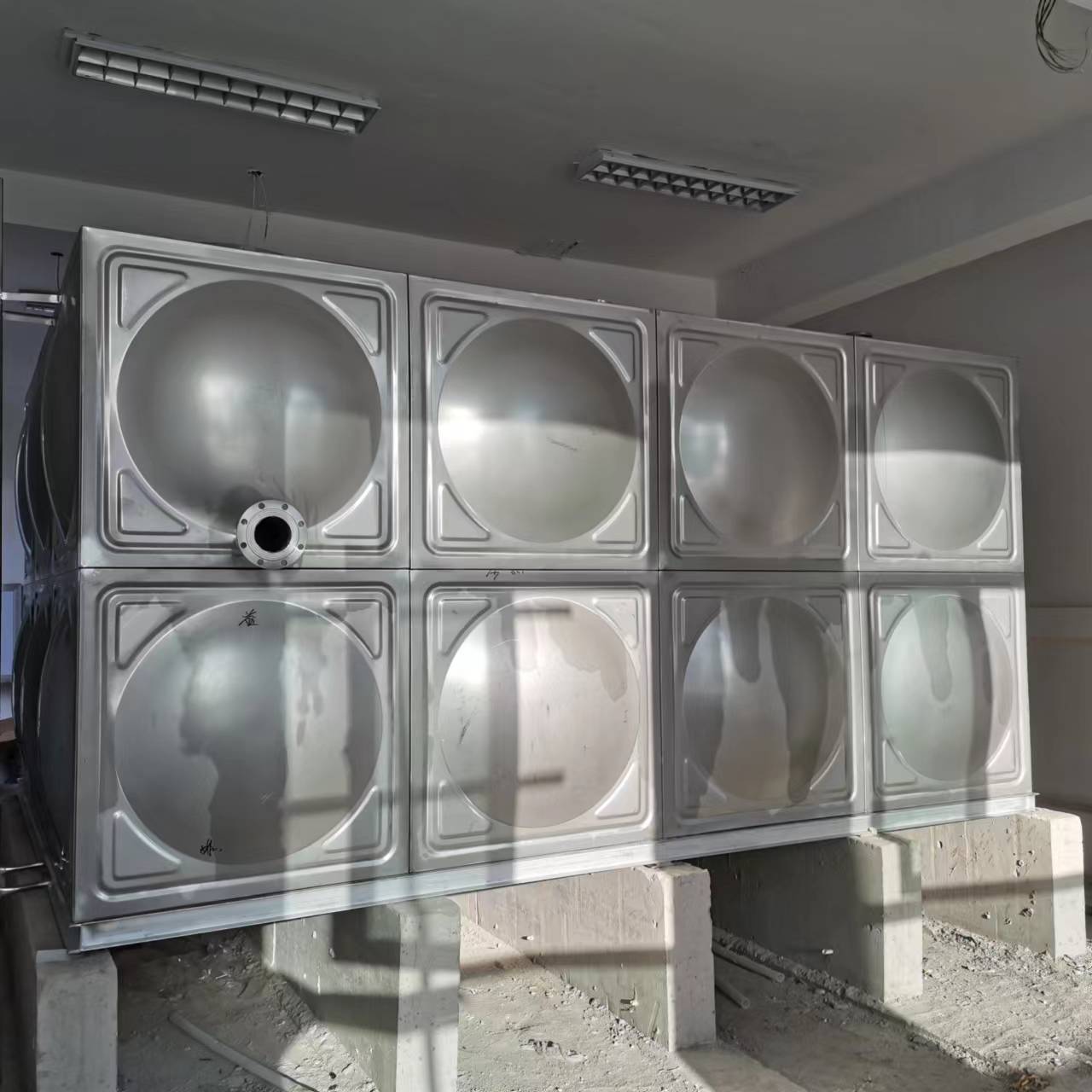 四、理想的力學(xué)構(gòu)造:全焊接不銹鋼消防水箱體采用球面與平板相結(jié)合,是理想的機(jī)械結(jié)構(gòu)..此不銹鋼水箱線條流暢,外觀造型美觀..